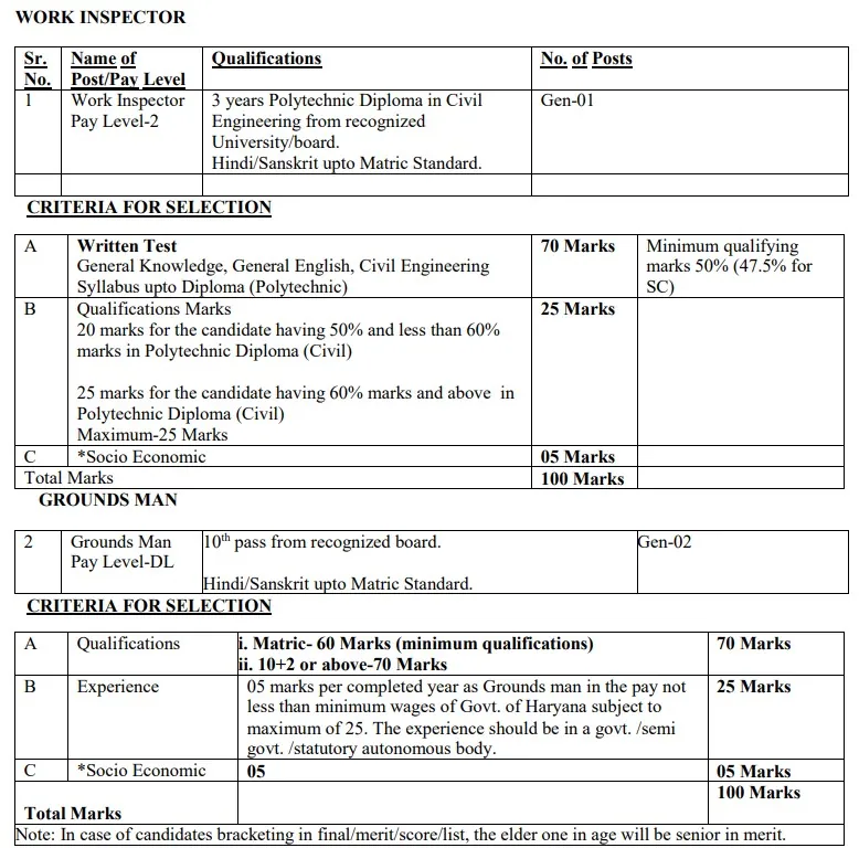 - वर्क इंस्पेक्टर (Work Inspector) : उम्मीदवार ने किसी भी सरकारी मान्यता प्राप्त संस्थान से सिविल ब्रांच में डिप्लोमा पास किया हुआ हो और 10 वीं कक्षा तक हिंदी/संस्कृत विषय को पढ़ा हुआ हो।